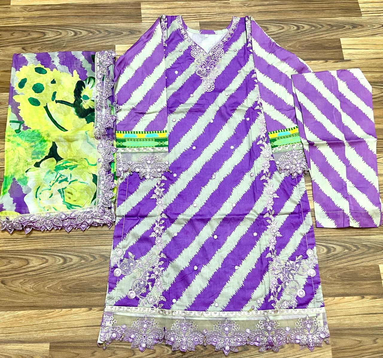 • Shirt: Premium quality lawn fabric with an all-over digital print, enhanced with delicate embroidery on the neckline, sleeves, and daman. The fusion of print and threadwork brings a touch of luxury and sophistication.